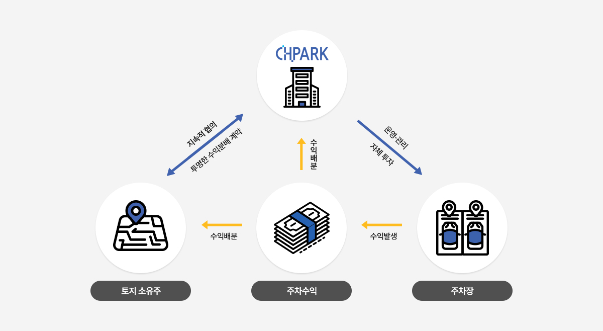 토지 소유권을 빌리지 않은 상태로 주차장 운영권만을 위임받아 관리합니다. 투명한 수익배분 계약을 통해 이익을 극대화 하고 CHPARK의 TOTAL 위탁 관리 서비스를 제공합니다.
