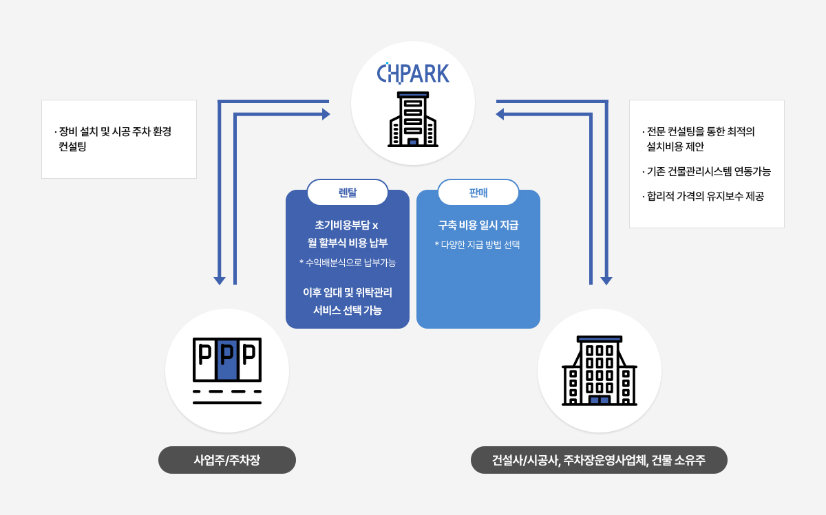 주차장 무인화를 위한 주차관제 시스템을 판매하고 랜탈해 드립니다. 다양한 환경에서 무인주차관제시스템이 필요한 고객분들에게 주차장 현장에 알맞은 시스템을 제안 드리고 컨설팅을 진행해드립니다. 단순 판매/렌탈 뿐 아닌 구축, 시스템운영 및 유지보수 옵션도 제공해 드립니다.